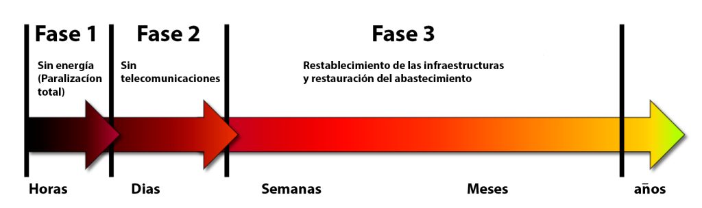 Fase 1: Un corte total y generalizado del suministro eléctrico puede durar horas a días, afectando también las infraestructuras.